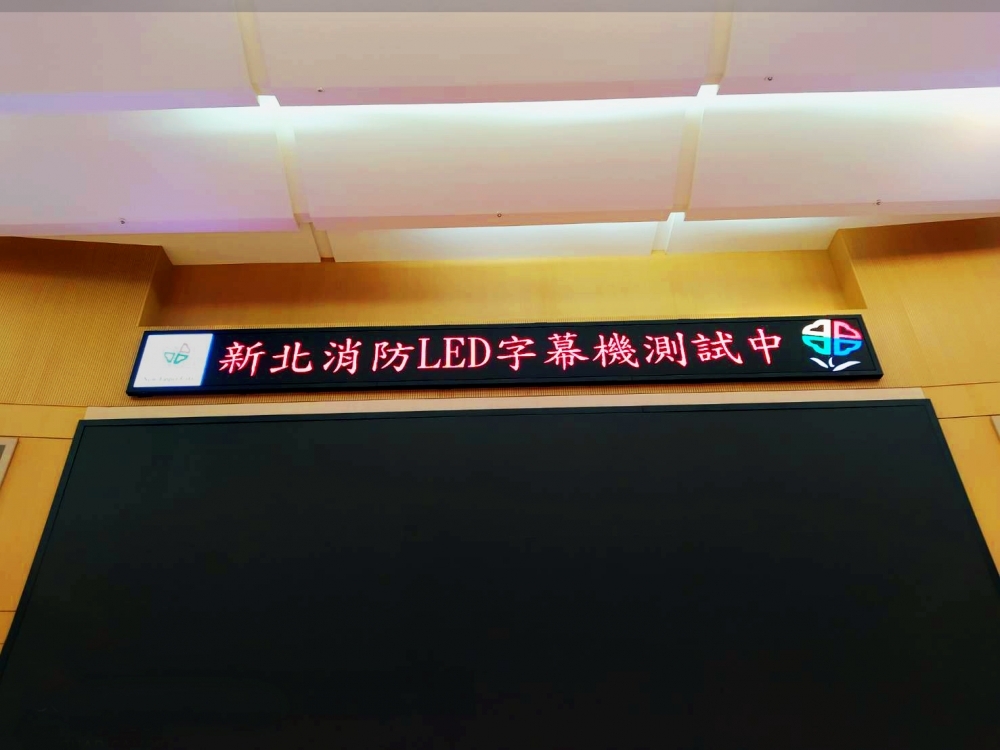 新北災害應變中心主電視牆上方設立LED字幕機,讓各式會議都能一眼明瞭會議主題。在開會期間也能隨著跑馬燈即時得到第一手訊息!(๑و•̀ω•́)و☆ 燈點間距 P4 像素構成 高8字 寬92字 共可顯示736字 模組尺寸 高61.2cm 寬598.8cm 模組解析度 高128點 寬1472點 共計188416點